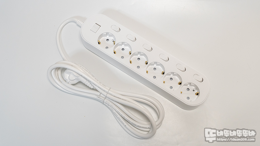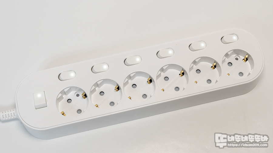멀티탭 앞쪽에 메인 스위치 그리고 개별 스위치로 구성된 6 구로 구성되어 있는데 LED 컬러가 화이트라 조금 아쉬움이 있습니다.