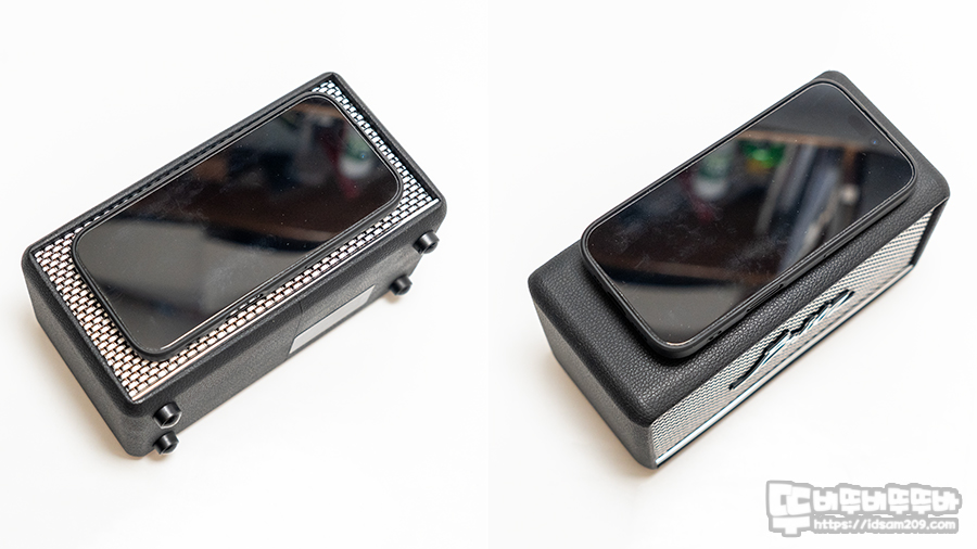 제품의 크기를 가늠하기 위해 아이폰 16 Pro를 스피커에 올려놓은 모습에서 브리츠 BZ-RK101 블루투스 스피커의 실제 크기가 짐작되실 겁니다.