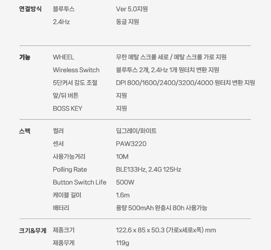 RF 2.4GHz, 블루투스 연결, 최대 4000 dpi 지원, PAW3220 센서, 125Hz 폴링 레이트, 저소음 스위치, 500mAh 배터리 내장, 완충 시 80시간 사용, 무게 119g 등의 정보를 확인할 수 있습니다.