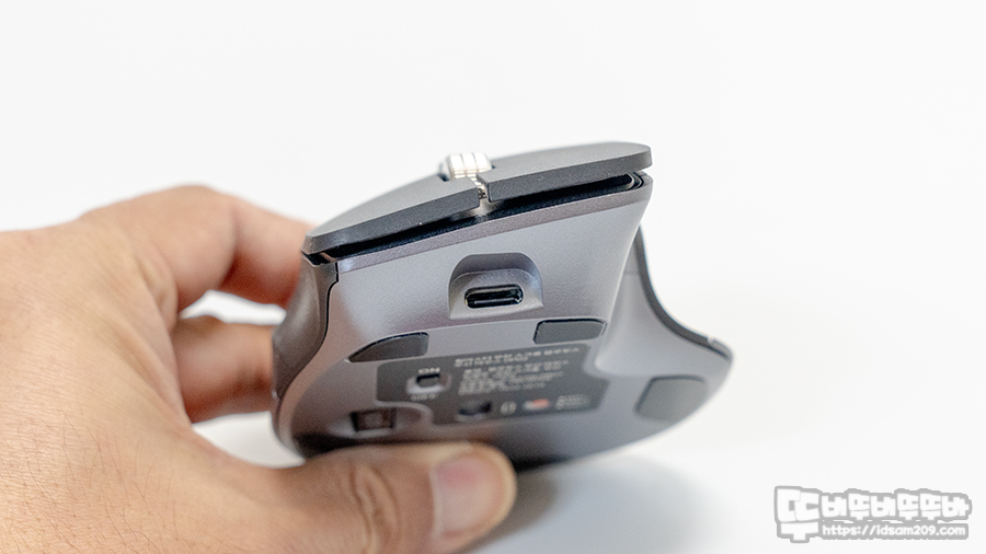 마우스 측면에는 RF무선, 블루투스 1, 블루투스 2 연결을 표현하는 LED 인디케이터를 확인할 수 있는데 LED 인디케이터는 무선 연결 표현과 DPI 단계 표현을 겸하며 연결된 LED를 1~5 단계 점멸로 현재 사용하는 DPI를 확인할 수 있습니다.