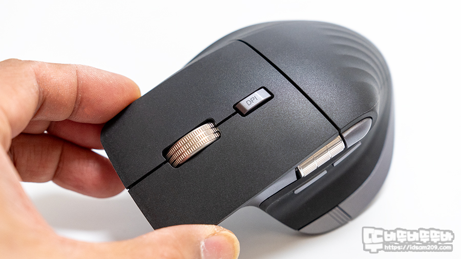 널찍한 버튼부와 메탈 소재가 사용된 휠 스크롤 그리고 버튼부 상단에 DPI 버튼 구성 모습.