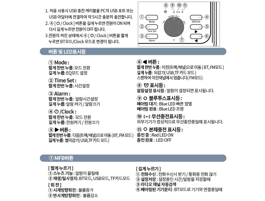 - 입력 모드 : 블루투스, MicroSD, USB, FM라디오, AUX입력, 시계