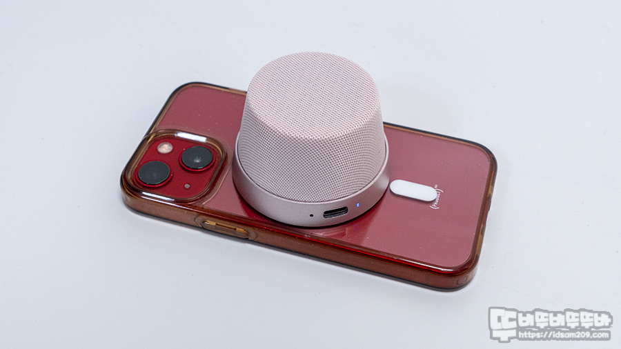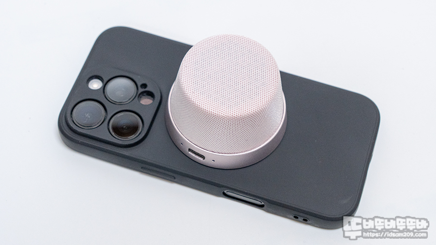 제품의 디자인 특성상 상단의 타공면을 통해 소리가 발산되는 만큼 위쪽 부분은 막으면 소리 전달에 문제가 있으니 맥세이프 거치로 사용하시거나 자석 부착이 가능한 메탈 소재에 부착 또는 제품에 제공되는 메탈 링을 이용하면 어디든지 부착이 가능하니 참고하시고요.