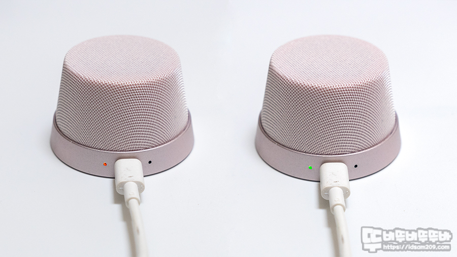 USB-C 단자를 이용한 충전 시 충전 중에는 Red LED, 완충 시 Green LED로 점등하여 완충되었음을 알려며 완충까지는 약 3시간 소요되며 완충 후 약 12시간 (볼륨 50%) 사용이 가능합니다.