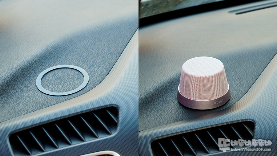 차량 대시보드에 평편한 부분이 왼쪽밖에 없어 그네틱 링을 부착하여 오딕트 On를 부착하고 스마트폰과 블루투스 연결로 내비게이션 사운드를 들으면서 운전 중 전화가 오면 전화 통화도 하고 편리하게 사용할 수 있었습니다.