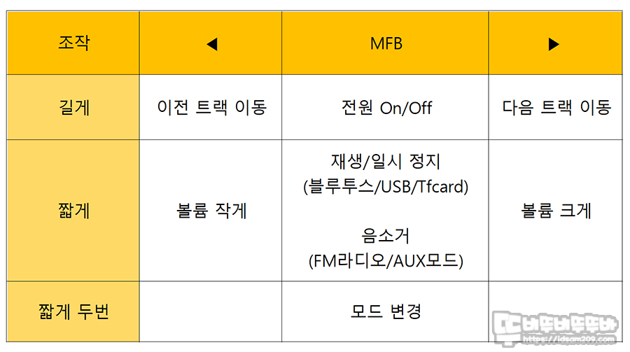 각 버튼은 짧게 또는 길게, 짧게 두 번 누르는 형태로 입력 모드에 따른 다양한 기능을 사용할 수 있으며 특히 AUX 모드의 경우 외부의 사운드가 입력되어 재생되는 구조이기에 음소거만 가능하니 참고하시기 바랍니다.