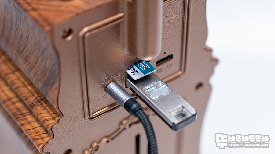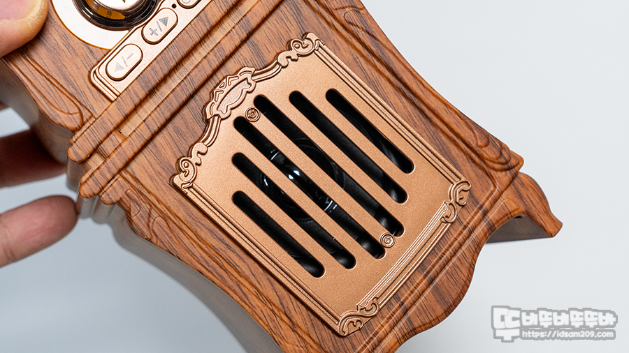 고풍스러운 그릴 느낌의 아랫부분은 정격 7W 52mm 유닛이 내장되어 선명한 사운드를 들려주며 제품 뒷면에는 USB-C 충전 단자와 USB-A 메모리 단자, MicroSD 슬롯, 외부 소리를 연결할 수 있는 AUX in 단자로 구성된 것을 확인할 수 있습니다.