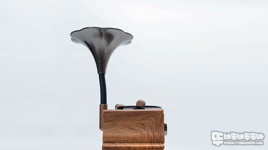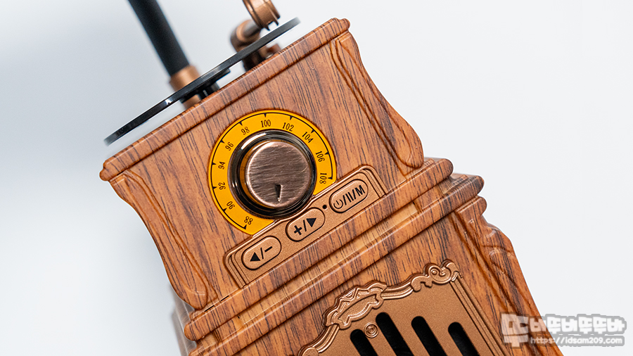 제품 상단에 나팔 혼, 축음기 모형 상단, 노브를 이용한 FM 주파수 조절, 3 버튼 컨트롤러 구성으로 전원 On/Off 및 입력 모드 변경, 트랙과 볼륨 조절이 가능합니다.