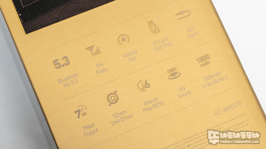블루투스 5.3 / FM 라디오 / 아날로드 다이얼 / MicroSD & USB 메모리 플레이 / AUX 입력 / 7W 출력 / 52mm 드라이버 유니 사용 / 6 시간 사용 (50% 볼륨) / HD 사운드 / 1800mAh 배터리 내장 등을 확인할 수 있습니다.