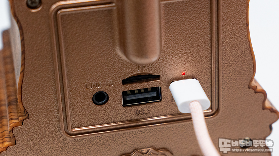 고풍스러운 그릴 느낌의 아랫부분은 정격 7W 52mm 유닛이 내장되어 선명한 사운드를 들려주며 제품 뒷면에는 USB-C 충전 단자와 USB-A 메모리 단자, MicroSD 슬롯, 외부 소리를 연결할 수 있는 AUX in 단자로 구성된 것을 확인할 수 있습니다.