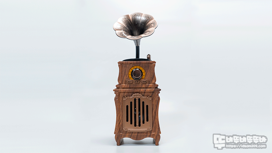 제품 상단에 나팔 혼, 축음기 모형 상단, 노브를 이용한 FM 주파수 조절, 3 버튼 컨트롤러 구성으로 전원 On/Off 및 입력 모드 변경, 트랙과 볼륨 조절이 가능합니다.