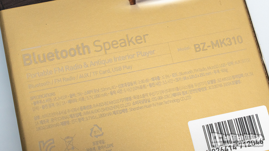 블루투스 5.3 / FM 라디오 / 아날로드 다이얼 / MicroSD & USB 메모리 플레이 / AUX 입력 / 7W 출력 / 52mm 드라이버 유니 사용 / 6 시간 사용 (50% 볼륨) / HD 사운드 / 1800mAh 배터리 내장 등을 확인할 수 있습니다.