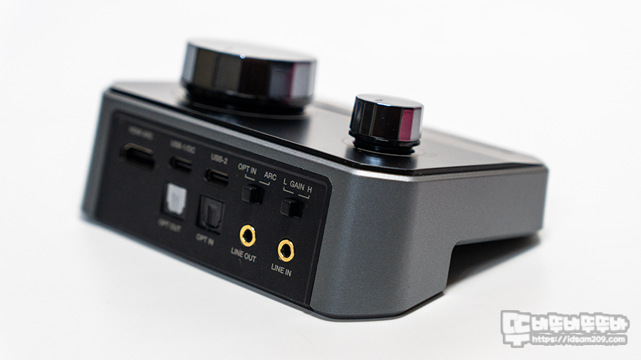기본적으로 후면에 USB-1/DC는 가장 메인으로 PC 연결 시 USB-C 단자를 통해 장치 인식 및 DC 5V 1A 전원 공급받으며 PC가 아닌 경우 USB-1 단자는 DC 전원을 공급받으면서 USB-2와 Line 입력, 옵티컬 입력 또는 HDMI(ARC) 등을 활용하여 듀얼 사운드 입력으로 사용할 수 있습니다.