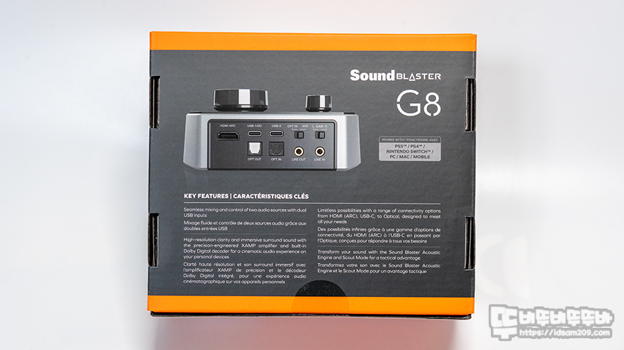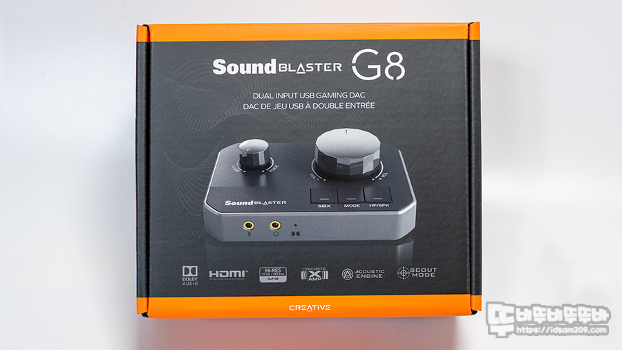 사운드 블라스터 G8 패키지는 제품의 이미지와 돌비 오디오, HDMI, Hi-Res 32Bit/384kHz, 좌우 독립형 XAMP, Acoustic Engine, Scout Mode 등 제품의 포인트 정보와 G8 메인 특징이라 할 수 있는 듀얼 입력을 지원한 게이밍 DAC 임을 강조하고 있습니다.