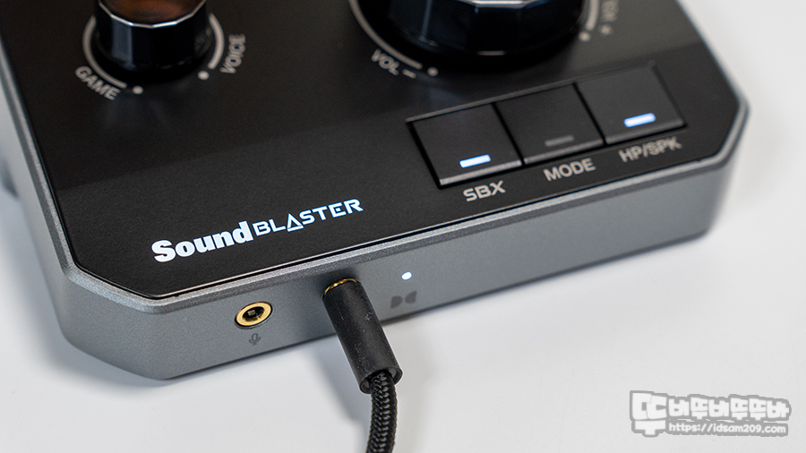 위에서 보았을 때 보이는 조작 버튼 구성을 살펴보면 게이밍 헤드셋에 많이 적용된 게임 및 Chat 믹스 노브와 메인 볼륨 노브를 메인으로 어쿠스틱 엔진/스카우트 모드/EQ를 선택할 수 있는 SBX 버튼, DSP 또는 다이렉트 모드로 선택할 수 있는 MODE 버튼 그리고 헤드폰과 스피커 출력을 선택하는 버튼으로 구성되어 있으며 전원 공급 시 사운드블라스터 로고에 화이트 LED, 각 모드 사용 시 사용하는 기능을 표현하는 LED 인디케이터로 작동상태를 쉽게 알 수 있습니다.