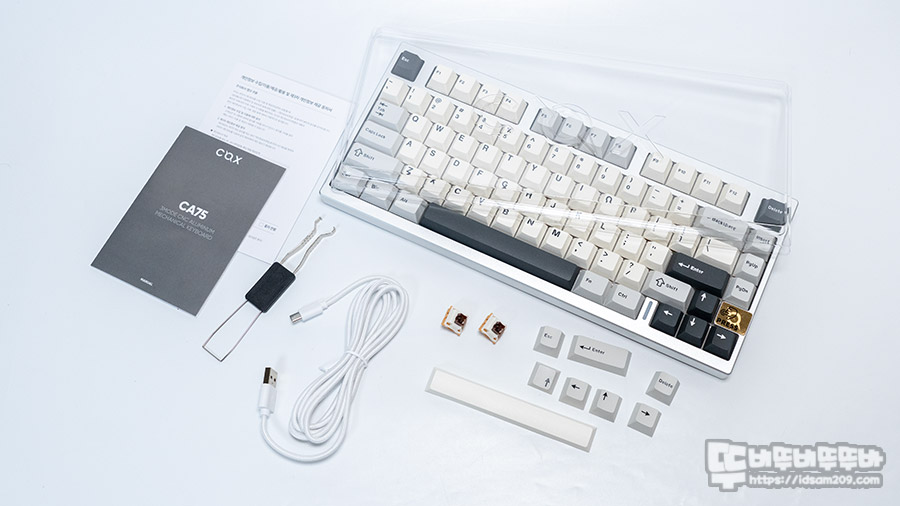 제품은 CA75 키보드 본체, 투명 블리스터 커버, 키캡&스위치 리무버, 교체용 키캡, USB-C to A 케이블, 여분 스위치 그리고 사용 설명서로 구성되어 있습니다.
