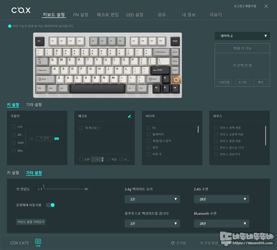 COX 콕스 CA75 3 모드 CNC 알루미늄 기계식 키보드의 전용 소프트웨어는 생각보다 심플한 편이며 키를 직접 입력 또는 자판 배열을 띄워 교체 가능한 키 스왑 기능과 리스트의 멀티미디어나 마우스 기능으로 대체가 가능한 기능을 제공합니다.