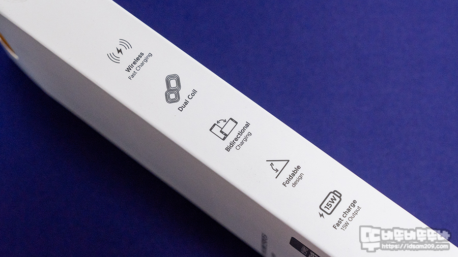패키지 측면에는 빠른 무선 충전, 듀얼 코일 사용, 가로 또는 세로 양방향 충전, 폴더블, 15W 고속충전을 지원하는 내용 등 제품의 포인트 정보를 아이콘으로 인쇄되어 있네요.