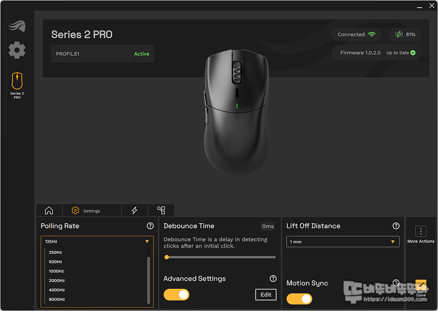 본격적인 기능을 설정할 수 있는 세팅 메뉴에서는 125 / 250 / 500 / 1000 / 2000 / 4000 / 8000 Hz 폴링 레이트를 지원하며 디바운스 타임의 경우 0 ~ 16ms 설정과 어드스 세팅을 통해 세밀한 조정이 가능합니다.