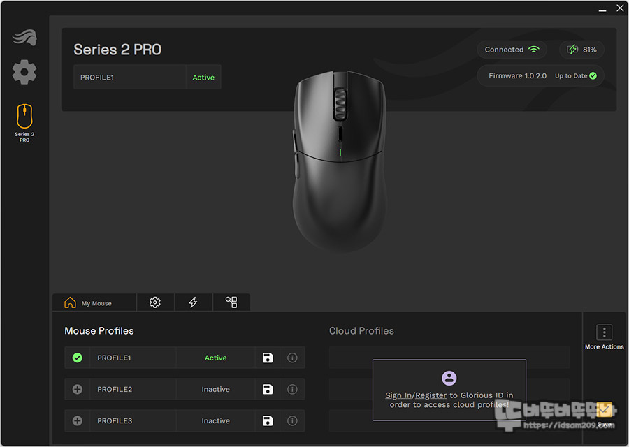 왼쪽 메뉴 아래의 마우스를 클릭하면 세부 항목으로 변경되는데 가장 처음 화면인 My Mouse 메뉴에서는 연결 상태, 배터리 잔량, 펌웨어 정보 그리고 프로파일 정보를 보여주고 있으며 클라우드 프로파일을 사용하기 위해서는 회원 가입이 필요하니 참고하시기 바랍니다.