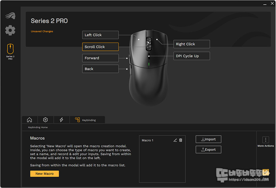 이후 위의 이미지 화살표 방향대로 " 키 바인딩 홈 ' 글씨를 마우스로 클릭하시면 오른쪽 하단과 같이 키 바인딩 메뉴로 변경되시는 걸 확인할 수 있는데 마우스 버튼 펑션 메뉴와 키 바인딩 메뉴가 같은 위치에서 표현되다 보니 Home이라는 전환 메뉴를 눌러줘야 추가적인 기능을 사용할 수 있었습니다.