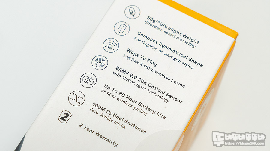 55g 초경량 무게, 컴팩트한 대칭형 디자인, 유무선 연결 지원, BAFM 2.0 26k 옵티컬 센서 그리고 모션 싱크 지원, 1KHz 기준 80시간 사용 가능, 더블클릭이 없는 100M 수명의 광 스위치 탑재, 2년 품질보증을 확인할 수 있습니다.