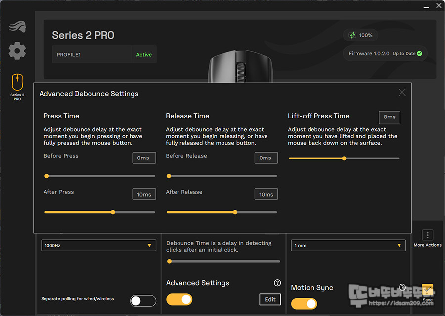 본격적인 기능을 설정할 수 있는 세팅 메뉴에서는 125 / 250 / 500 / 1000 / 2000 / 4000 / 8000 Hz 폴링 레이트를 지원하며 디바운스 타임의 경우 0 ~ 16ms 설정과 어드스 세팅을 통해 세밀한 조정이 가능합니다.