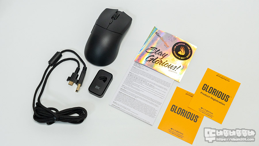 제품은 마우스 본체, 전용 USB-C to A 케이블, 8K 무선 리시버, 스티커, 간단 안내서와 카드로 구성되어 있는데요.