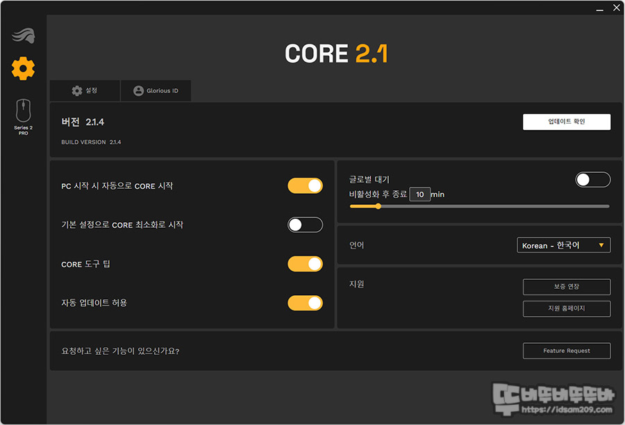 글로리어스 코어 2.1을 실행하면 제품의 모델명을 인식하여 표현해 줍니다.