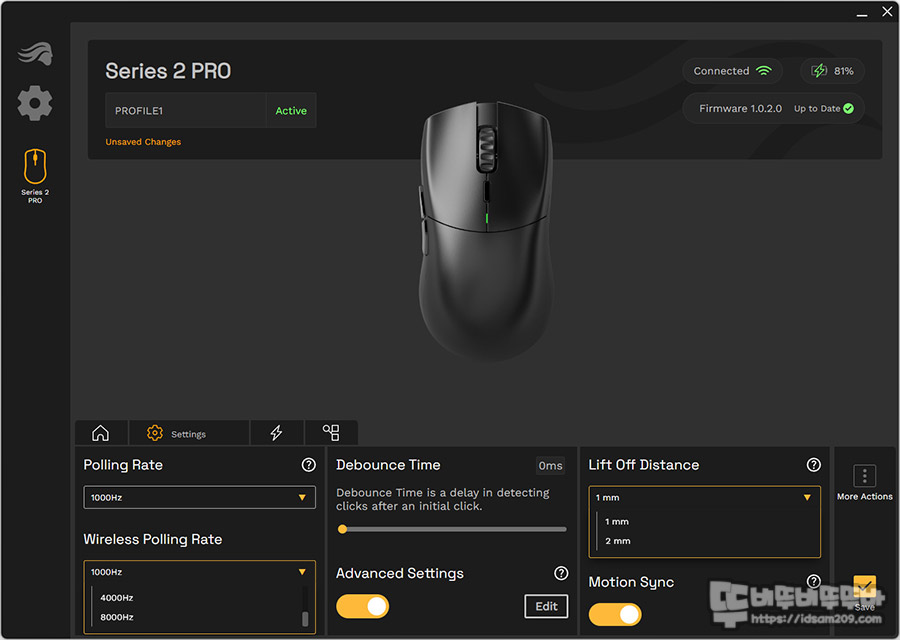 또한 무선과 유선의 폴링 레이트를 다르게 설정하는 옵션도 제공하며 L.O.D는 1 또는 2mm 설정과 모션 싱크 사용을 선택할 수 있습니다.