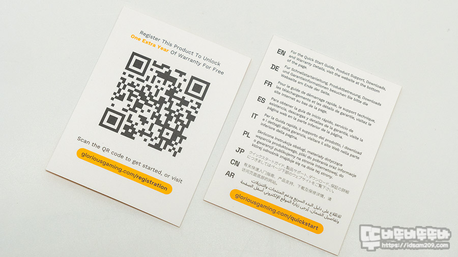 카드 안쪽의 제품등록 시 1년 보증을 연장하는 QR 코드와 관련 설명이 따로 인쇄된 것을 확인할 수 있습니다.