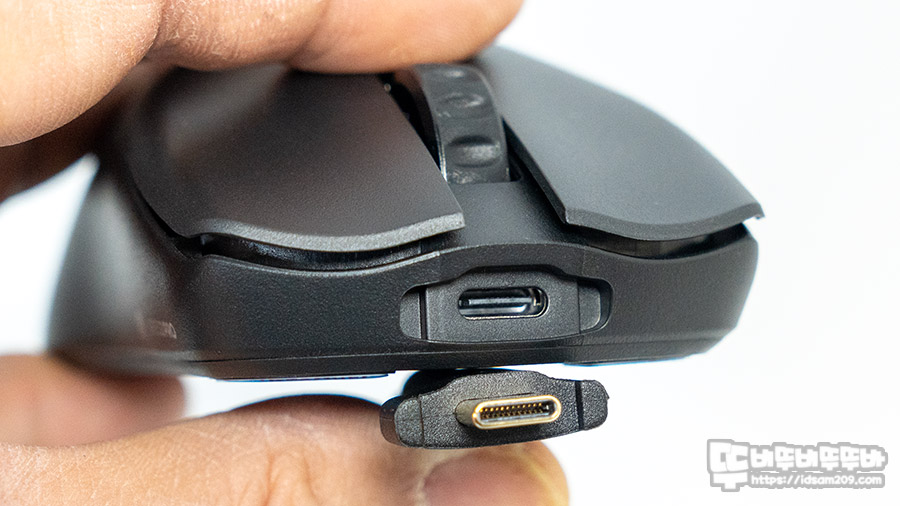 전면에는 유선 사용과 충전을 담당하는 USB-C 단자가 위치하고 있으며 전용 케이블을 연결할 수 있는 몰딩이 적용되어 있어 케이블 연결 시 좌우 흔들림 없이 안정적으로 충전 및 유선으로 사용이 가능합니다.