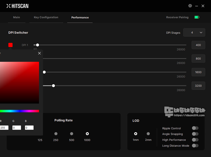 필자가 리뷰하는 제품은 기본 1K 동글을 사용하기에 프로그램 상에서는 1000Hz까지 사용이 가능하며 그 외로 LOD 설정 리플 컨트롤, 앵글 스냅핑 그리고 무선 사용 시 성능을 중요시하는 High Performance와 안정성을 높이는 Long Distance Mode 선택을 지원합니다.