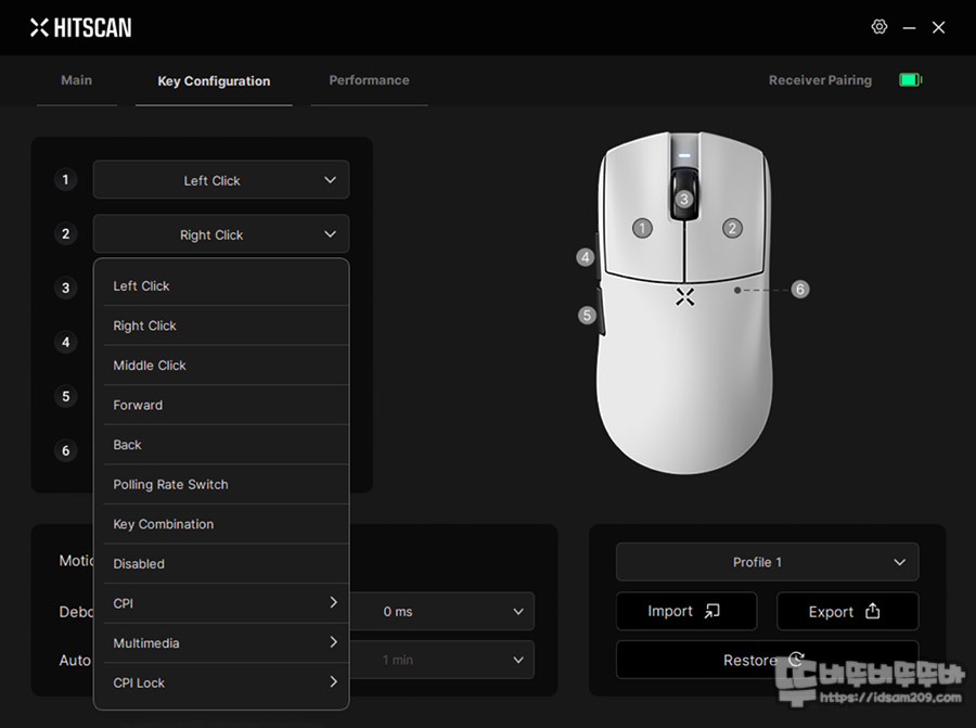 키 컨피그레이션 메뉴에서는 버튼 기능을 부여할 수 있는데 보시는 것과 같이 게이밍에 도움이 되는 스페셜 한 기능은 없으며 메인 버튼과 사이드 버튼 그리고 휠 버튼 심지어 DPI 버튼의 기능을 변경할 수 있게 구성되어 있네요.
