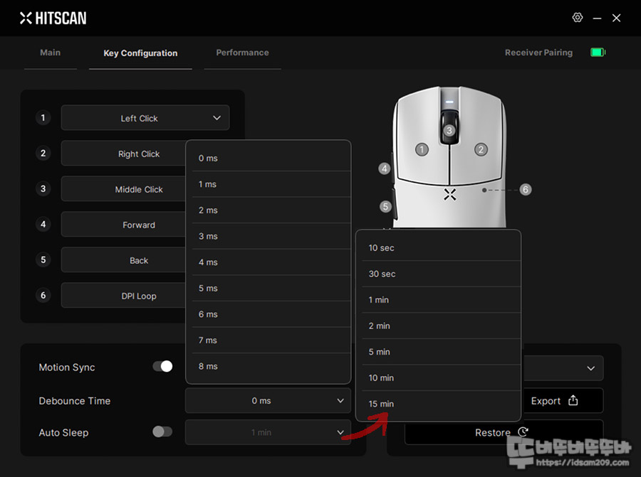 그 외로 모션 싱크, 디바운스 타임, 오토 스립 시간 설정이 가능하며 프로파일 선택화 복구 기능을 확인할 수 있습니다.