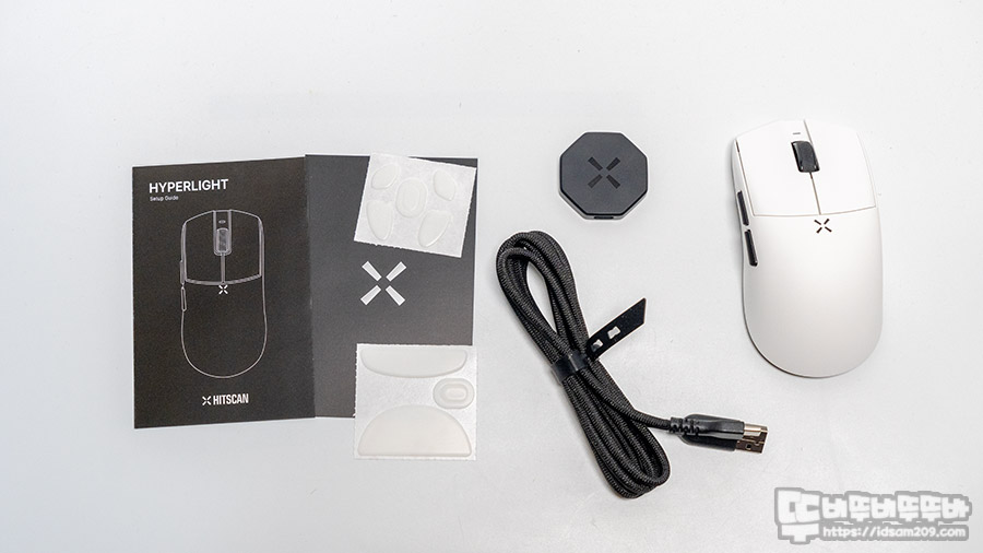 제품은 하이퍼라이트 마우스 본체와 USB-C to A 케이블, 8각 형태의 1K 무선 리시버, 사용 설명서와 마우스 피트 2종을 제공하고 있고요.