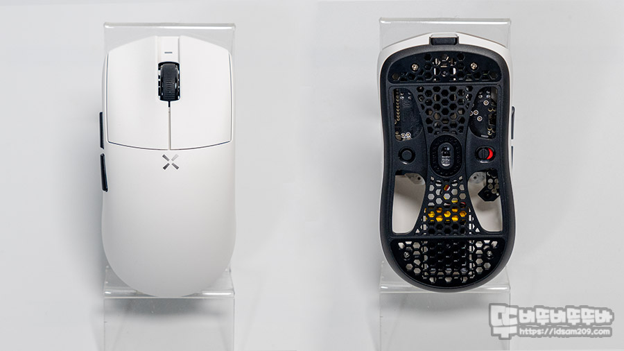 HITSCAN 히트스캔 하이퍼라이트 초경량 무선 게이밍 마우스 대칭 쉘에 절개형 버튼 구조, DPI 버튼이 없는 상판 디자인 그리고 타공과 개방형으로 디자인된 하판에는 마우스 피트가 부착되어 있지 않은 게 특징입니다.