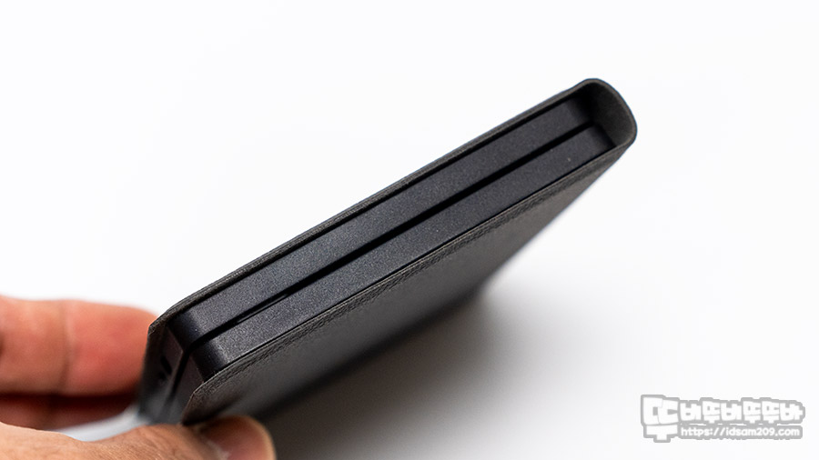 왼쪽 모서리 부분에 자석이 내장되어 접었을 때 오른쪽의 실리콘 패드와 결합되어 쉽게 오픈되지 않고 안정된 결합 형태를 유지합니다.