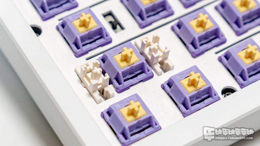 정방향 기판 설계로 체리 프로파일 키캡을 사용이 가능하며 보강판에 부착된 체리 방식의 스빌라이저는 약간의 유격이 느껴지네요.