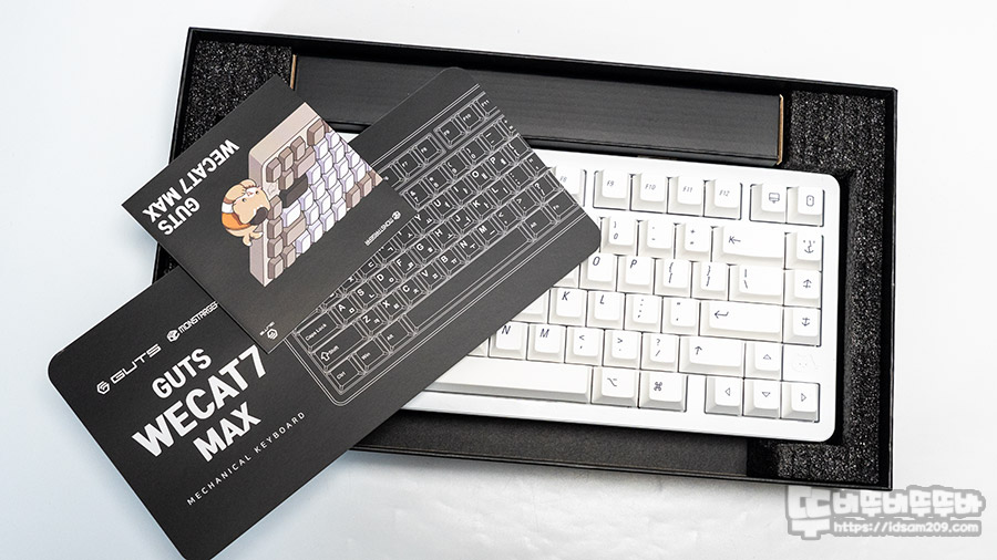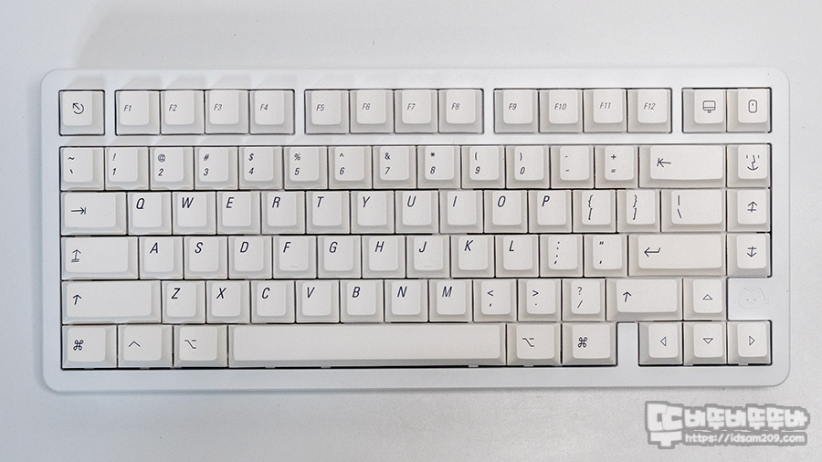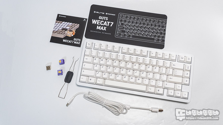 몬스타 가츠 위캣7 MAX 풀 알루미늄 기계식 키보드는 전기영동을 사용한 화이트(스완) / 화이트(블루라군)와 아노다이징을 사용한 골드 제품으로 출시했는데 필자가 리뷰한 제품은 화이트(스완)로 화이트 PBT 이중 사출 키캡에 MAC 키보드 각인이 사용된 게 특징이네요.