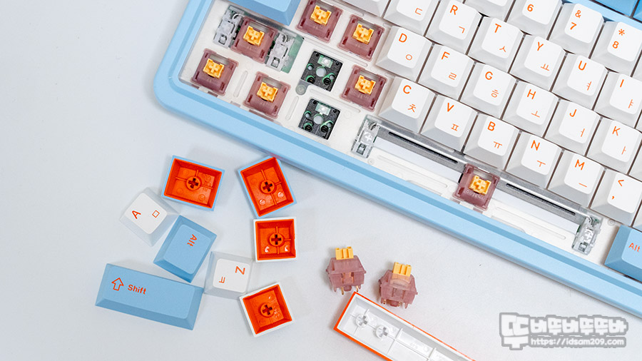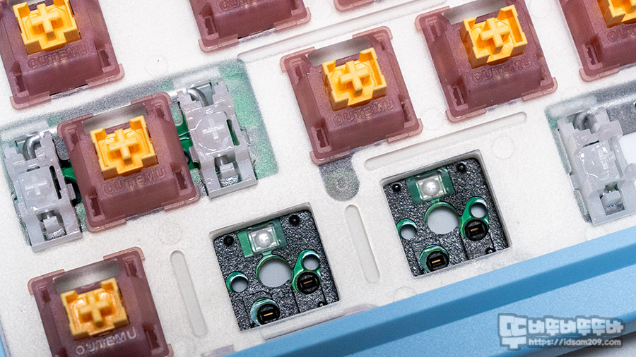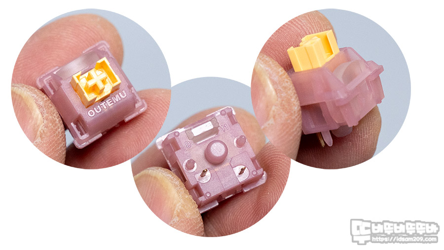 특히 스위치 내부에 LED 빛을 확산하는 투명 플라스틱이 추가되어 PCB 바닥에 부착된 SMD LED 빛을 손실 없이 키캡까지 확산하여 밝게 표현하는 특징이 있습니다.