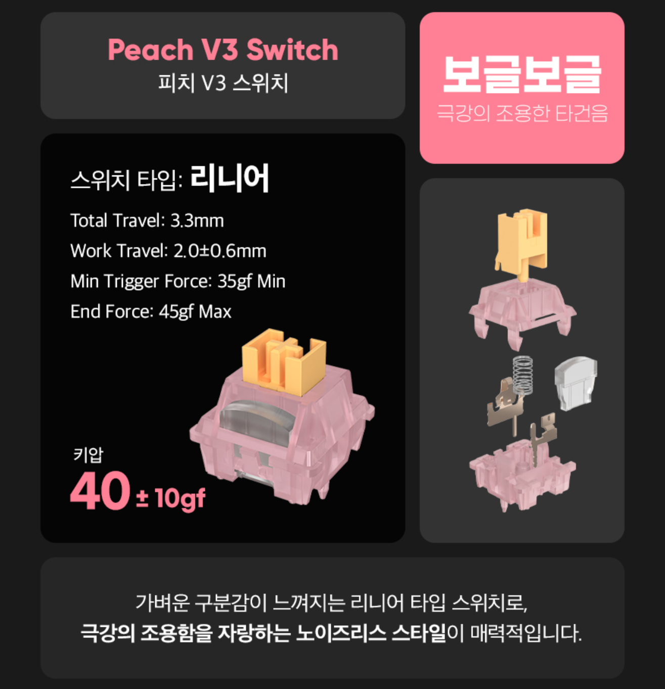 피치 V3는 최근 앱코나 콕스에서 출시한 저소음 축과 동일한 리니어 스탬 좌우에 실리콘 댐퍼가 있어 타이핑 시 소음을 줄여주는 역할을 하며 팩토리 윤활 처리가 되어있어 정숙한 게 특징이며 타이핑시 바닥 치는 느낌이 없어서 편안하게 사용할 수 있습니다.