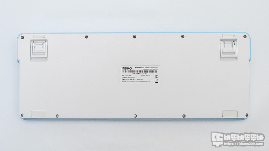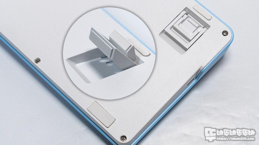 키보드 바닥면에는 미끄럼 방지 패드와 높이 조절 다리 구성을 확인할 수 있으며 하우징 채결 나사가 모두 노출되어 있는 만큼 분해 호기심을 자극하지만 사용자가 임의로 분해 후 문제가 발생한다면 서비스 지원이 어려운 만큼 분해는 신중하게 고려하시기 바랍니다.
