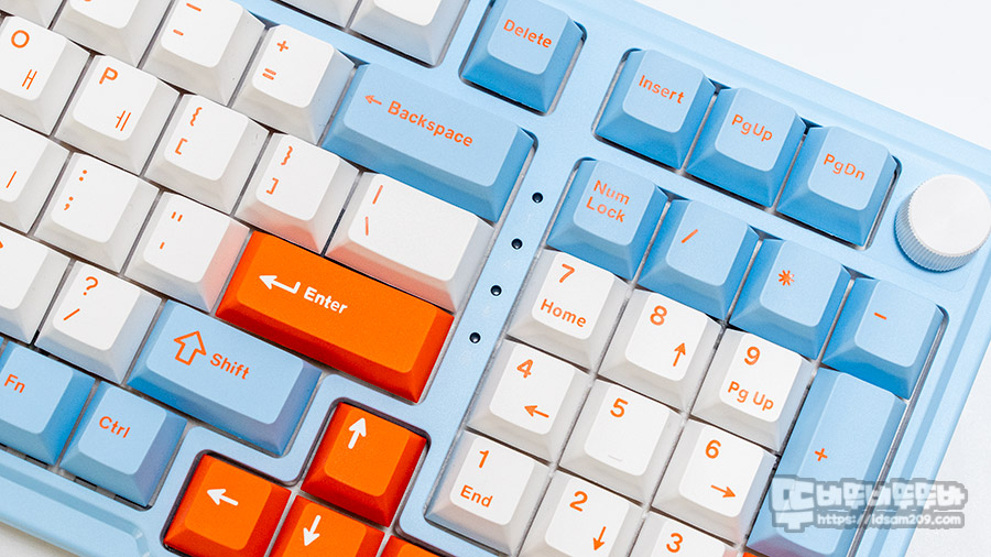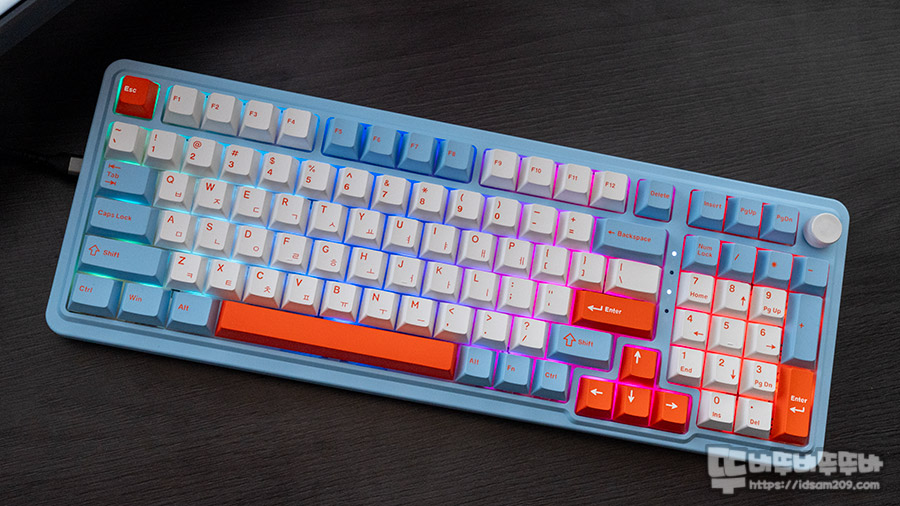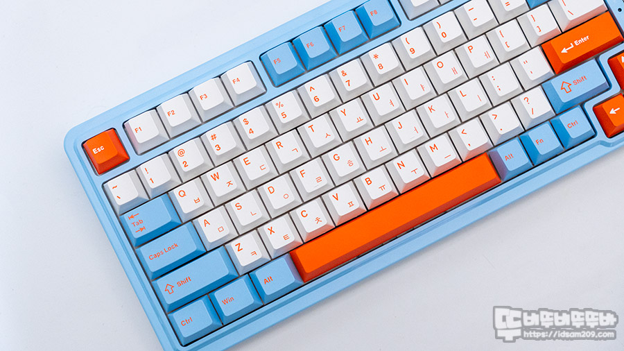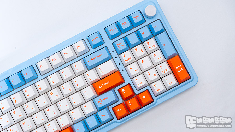 컴팩트형으로 디자인된 앱코 AK998 키보드 모습을 살펴보면 자판과 키패드는 화이트 컬러에 오렌지 컬러 각인, 모디 키는 스카이 블루 컬러, 포인트 컬러는 오렌지 컬러로 3톤 구성으로 화려하게 구성되어 있습니다.