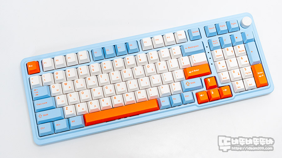컴팩트형으로 디자인된 앱코 AK998 키보드 모습을 살펴보면 자판과 키패드는 화이트 컬러에 오렌지 컬러 각인, 모디 키는 스카이 블루 컬러, 포인트 컬러는 오렌지 컬러로 3톤 구성으로 화려하게 구성되어 있습니다.