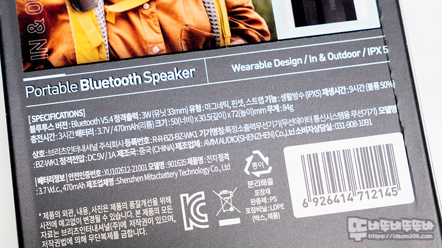 패키지 측면에 포인트 정보를 살펴보면.. 블루투스 버전 5.4, 집게 홀더, 마그네틱 플레이트, 핸드 스트랩, 9시간 재생, IPX5 생활방수, 3W 출력, 작고 가벼운 무게 등을 강조하고 있습니다.