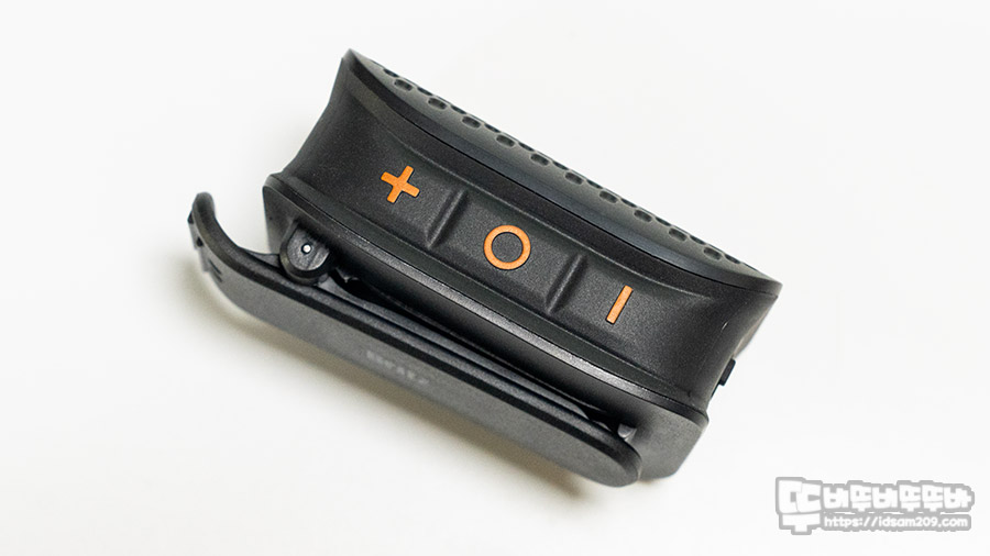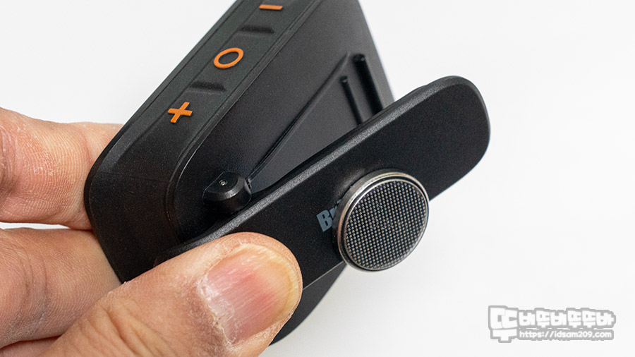 제품 측면에는 3 버튼 컨트롤러 구성으로 가운데 전원 버튼/재생 및 일시정지 버튼, +/-로 볼륨 조절 및 트랙 이동을 지원하여 간편하게 사용할 수 있었습니다.
