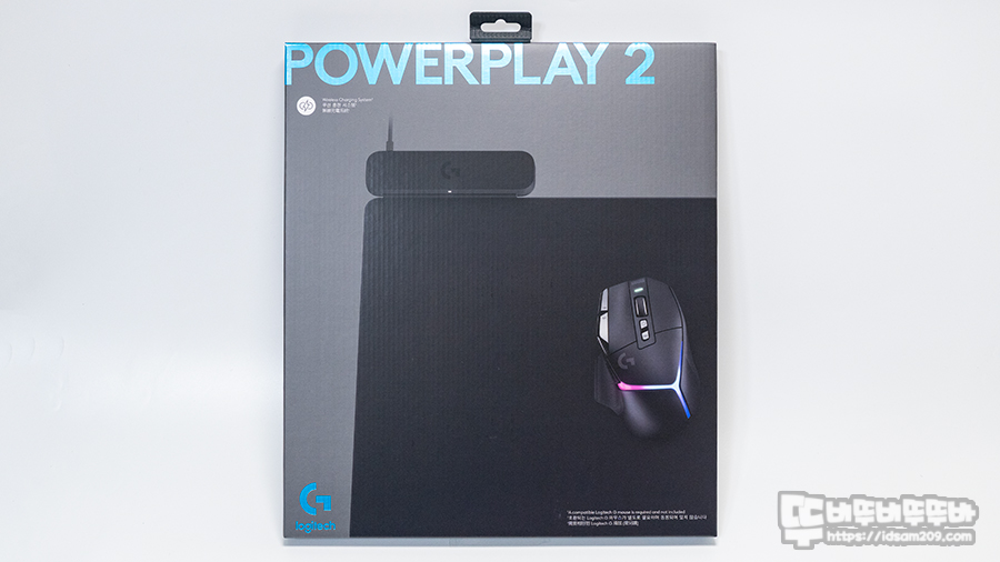 패키지에는 파워플레이2이라는 새 모델과 무선 충전 시스템 그리고 호환되는 로지텍 G 마우스가 필요하다는 문구로 사진의 마우스는 제공되지 않음을 강조하고 있습니다.