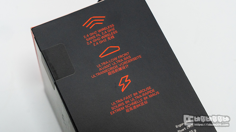 패키지 뒷면과 측면에는 2.5GHz 무선, 낮은 전면 버튼, 8K 폴링 레이트를 강조하고 있고요.