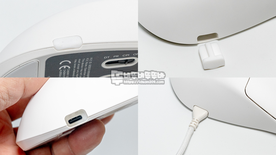 지금까지 대부분의 마우스는 전면에 충전 단자가 위치하고 있었지만 Cherry XTRFY M64 Pro는 전면이 낮게 디자인되어 클릭에 편안함을 주지만 측면에 위치한 USB 단자는 유선 사용 시 생각보다 불편한 감이 있고요.